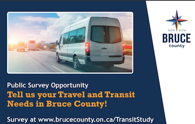 Bruce County is undertaking a Transit Demand and Feasibility Study to get input on the need and demand for transit solutions for County residents, workers, students, and visitors. The public is invited to participate in an initial public feedback opportunity, in the form of an online survey, that will help Bruce County develop an understanding of local travel needs.