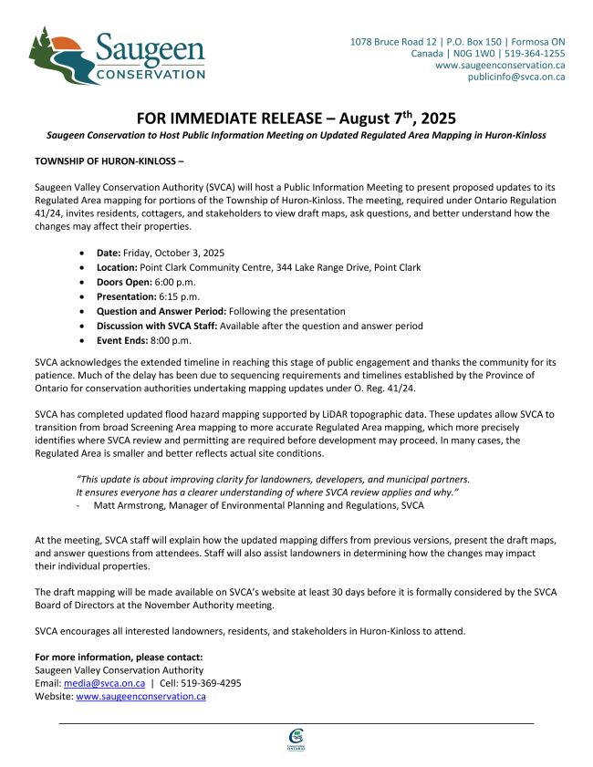 Saugeen Valley Conservation Authority will be holding a public information meeting to regarding proposed updates to Regulated Area mapping in Huron-Kinloss.